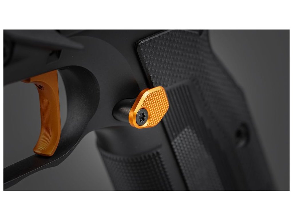 Opěrka palce Nově přepracovaná opěrka palce je opatřena bariérou, která eliminuje možnost tlaku palce střílející ruky na závěr. CZ TS 3 ORANGE je připravena také na leváky – pravá opěrka palce je dostupná jako příslušenství. Montážní otvory jsou na zbrani připraveny a zakryty krytkou.
