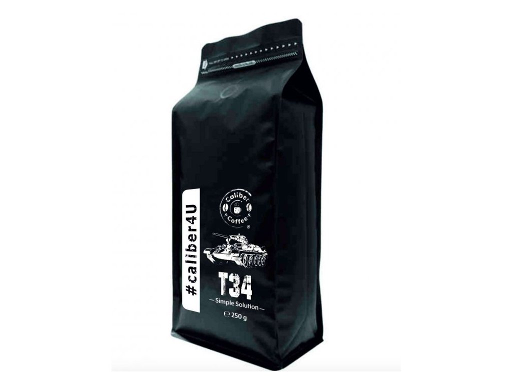 Káva je balena v černém sáčku Caliber Coffee se zipem, který zajišťuje, že káva zůstane po celou dobu skladování čerstvá. Design obalu vám vaši oblíbenou kávu připomene. Pro tuto kávu jsme zvolili téma tanku T-34, který byl během druhé světové války základem sovětských obrněných sil. Disponoval bezprecedentní kombinací palebné síly, mobility, ochrany a robustnosti. S celkovým počtem 80000 ks se stal se nejvíce vyráběným tankem druhé světové války. Stejně tak je druhým nejvíce vyráběným tankem všech dob.