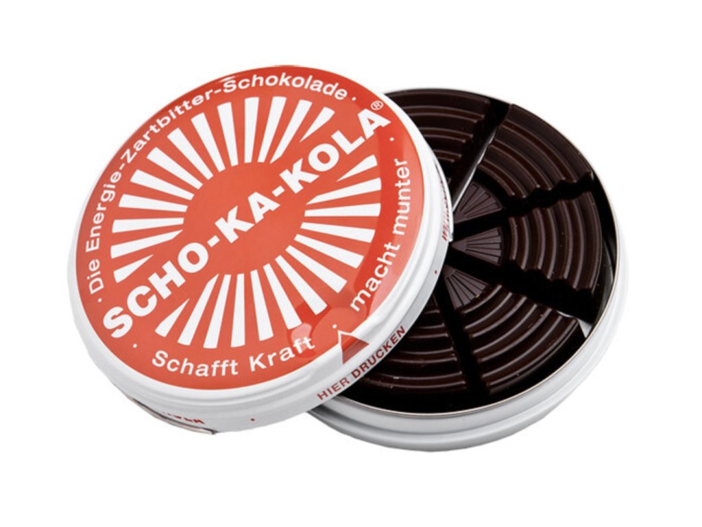 Energetická čokoláda Scho-ka-kola® je legendární německá energetická čokoláda, která se v původní hořké verzi vyrábí již od roku 1935, v mléčné verzi pak od šedesátých let 20. století. A pořád letí. Dodávána je a vždy byla ve slavné kulaté plechovce s výrazným designem bílých paprsků na červeném / modrém pozadí. Balení obsahuje 100 g této energetické bomby v 16 chutných dílcích. Obsahuje přírodní kofein extrahovaný z kakaa, z cola ořechů a z kávy, a dodávají člověku více energie a lepší koncentraci. Tento efekt vytvářejí právě kolové ořechy, jež jsou ovocem stromu cola, který roste hlavně v západní a střední Africe a jež obsahují podstatně více kofeinu než běžná káva. Hořká čokoláda Scho-ka-kola přináší bohatou hořkosladkou chuť opravdu kvalitní čokolády s 58 % kakaa. Tato vynikající chuť se v ní snoubí s vysokou dávkou koncentrované energie a svěžesti. Ochutnejte pochoutku olympijských atletů, vojenských pilotů, závodníků a sportovců. Pro každého, kdo preferuje sladkou chuť, ale nemíní se vzdát své dávky koncentrované energie. Scho-ka-kola je značka německých energetických čokolád, vyráběných berlínskou společností Scho-ka-kola GmbH. Tyto čokolády se vyznačují vysokým obsahem kofeinu, pocházejícího z kakaa, kávy a výtažku z kolového oříšku. Tradičně jsou balené ve stogramových kulatých plechových dózách, obsahujících 16 trojúhelníkových dílků čokolády. PARAMETRY PRODUKTU: