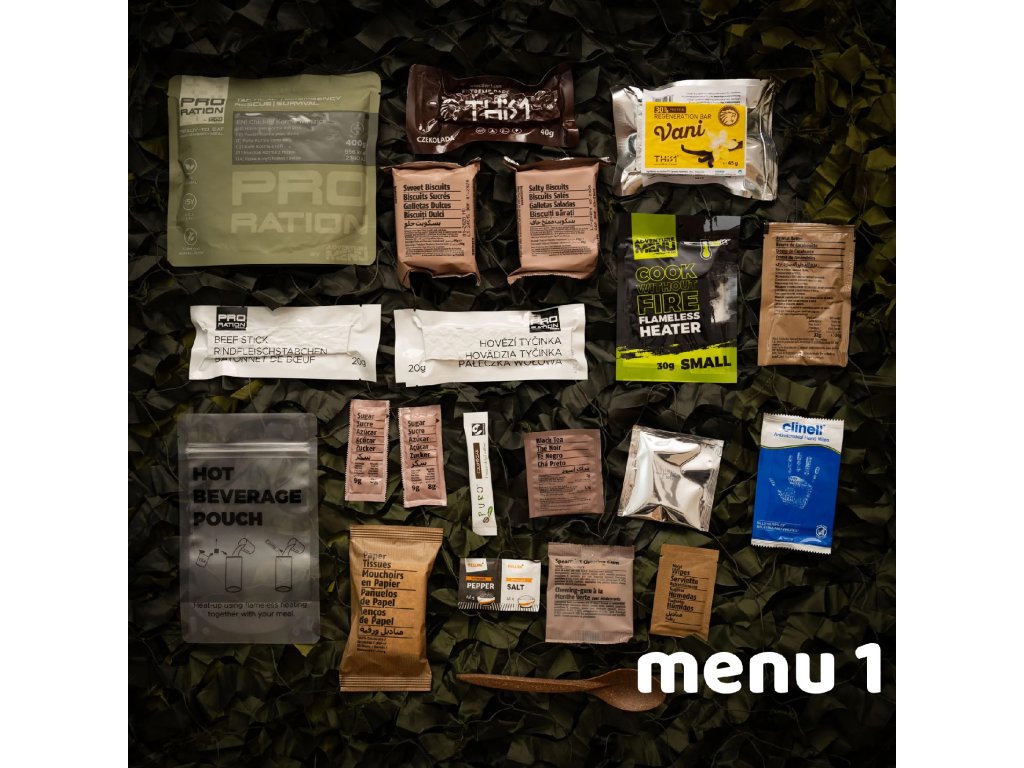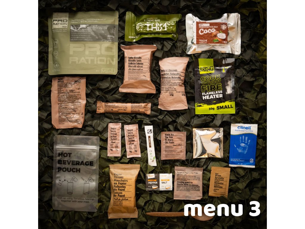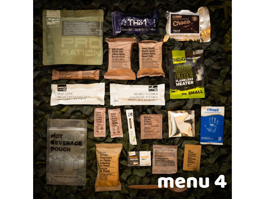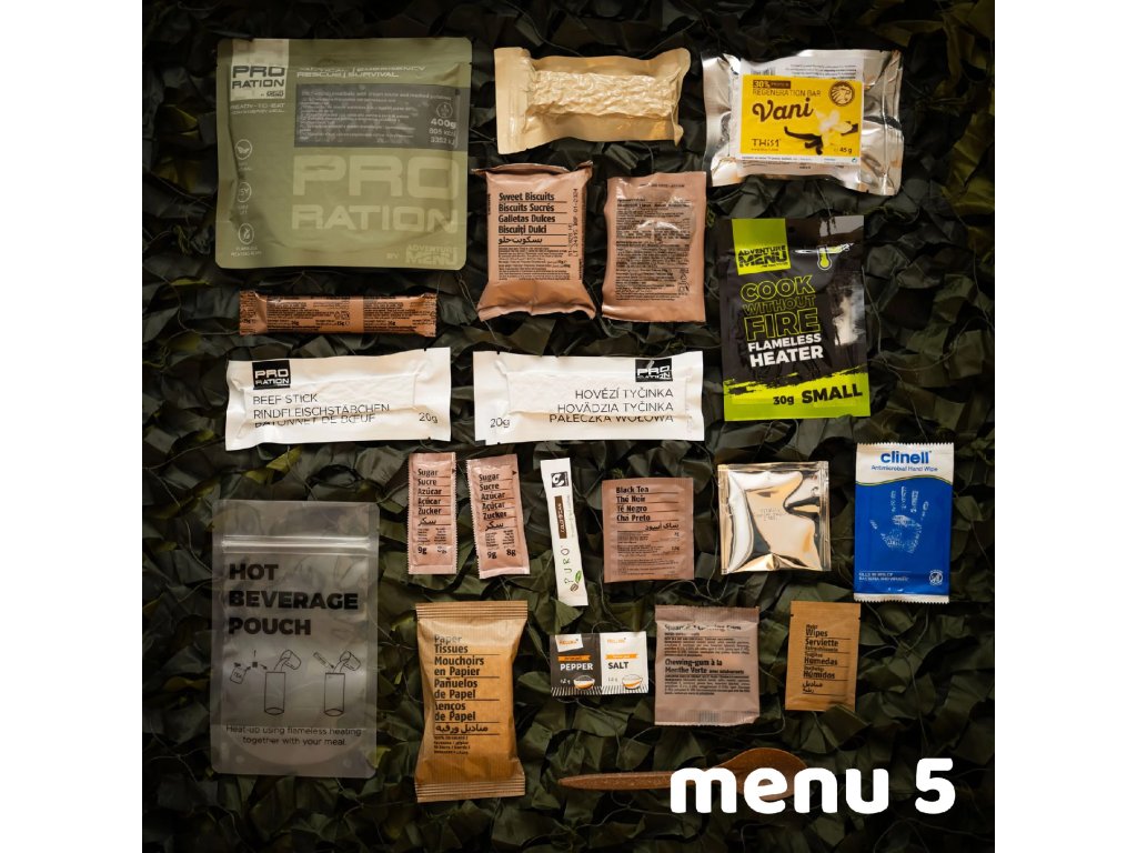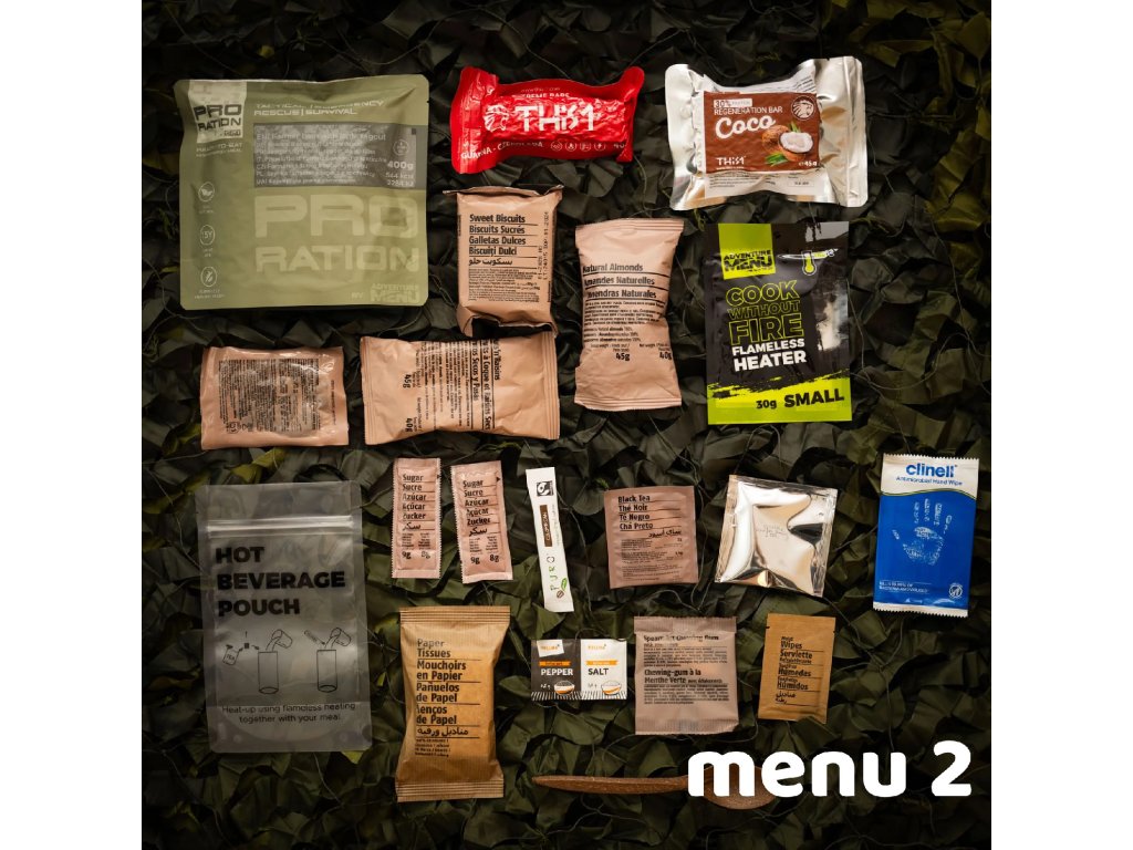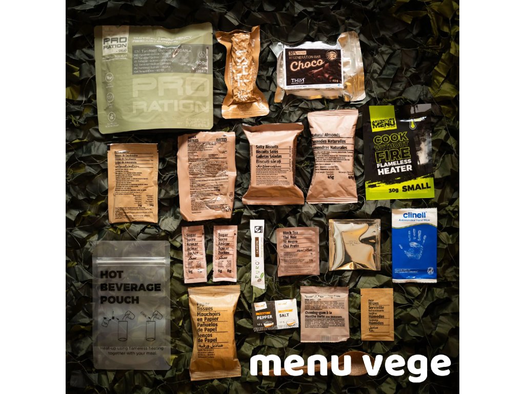 Kompletní balíčky potravin, tzv. MRE/BDP jsou ve výbavě mnoha složek jako nouzová dávka potravin pro použití v polních podmínkách. Nejenom vojáci si ale zaslouží kvalitní výživu. Známý český výrobce Adventure Menu přináší profesionální řadu nouzových potravin s označením Pro Ration. Tato dávka potravin je navržena tak, aby vyhovovala nejen širokému spektru profesionálů, ale každému, kdo se chystá do náročných podmínek a potřebuje spolehlivou a především chutnou zásobu potravin. Díky mimořádné trvanlivosti a velmi vyváženému složení Vám budou tyto dávky spolehlivým společníkem v každé náročné situaci. Všechny potraviny v balíčku se pyšní naprosto bezkonkurenční trvanlivostí až 15 let u potravin a až 50 let u pitné vody. To je solidní základ pro vaše domácí zásoby v případě nouzové situace. I přes tuto extrémně dlouhou dobou trvanlivosti jsou všechny pokrmy 100% přírodní a ručně vařené, což znamená ten nejlepší zdroj energie pro Vaše tělo i mysl. .-Všechna hotová jídla jsou připravena k okamžité konzumaci (Ready to eat) a nepotřebujete tak žádné další vybavení. Stačí jen použít ohřívací kapsli, která je součástí balíčku a můžete začít konzumovat přiloženou lžící. Tato potravinová dávka Vás nejen zasytí a dodá potřebnou energii, ale v balíčku naleznete také nezbytné příslušenství pro přípravu a konzumaci jídla, hygienické potřeby, ale třeba i dávku vitamínů a minerálů. |