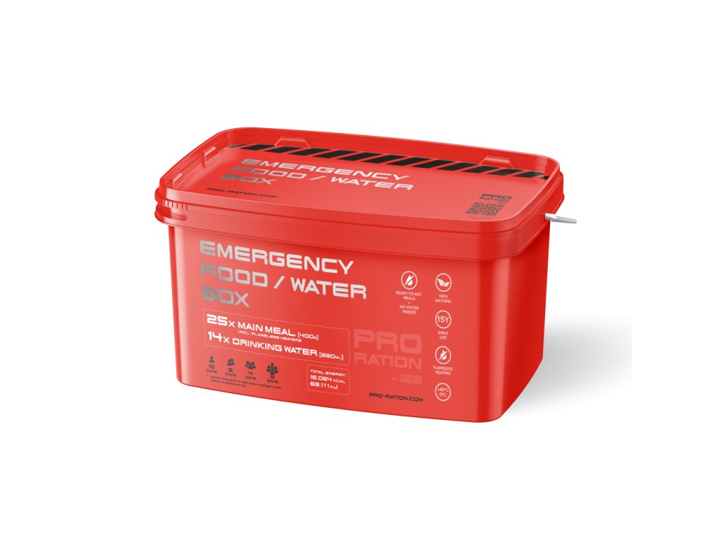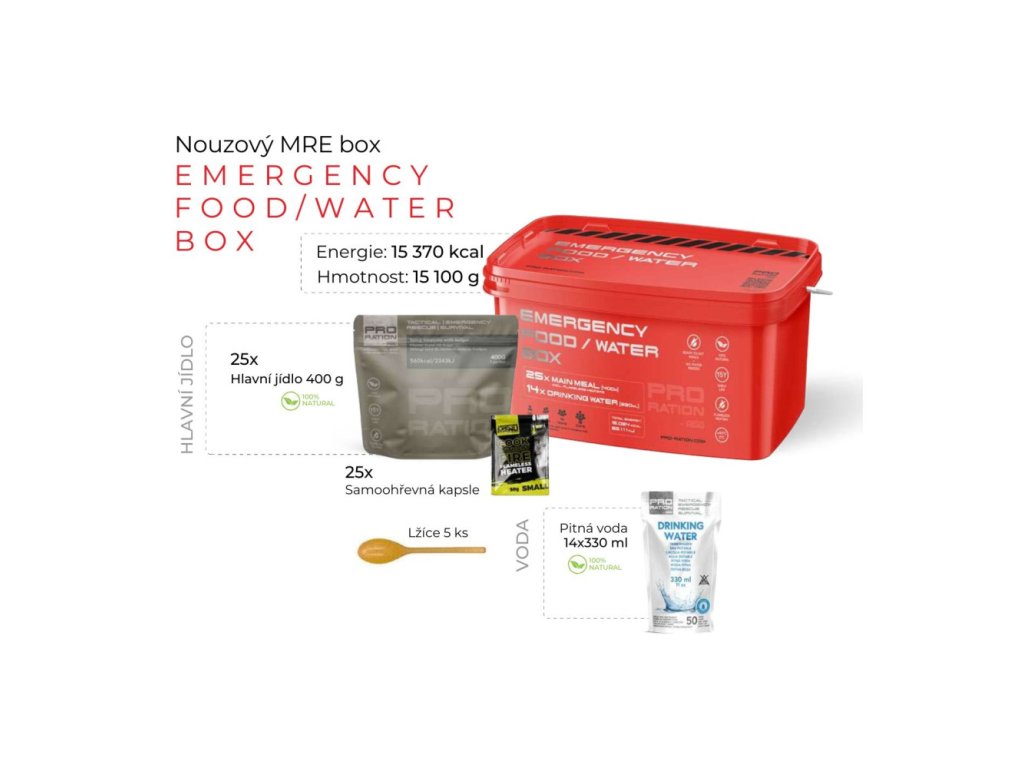Nouzový MRE box Emergency Food/Water box slouží pro zajištění základních potřeb v případě nouze. Známý český výrobce Adventure Menu přináší v profesionální řadě Pro Ration tyto skvěle připravené balíčky nouzových dávek potravin a vody. Jedná se o větší zásobu pro krizové situace, která obsahuje jen to nejnutnější, vodu, jídlo a potřeby pro přípravu a konzumaci. Všechny potraviny v balíčku se pyšní naprosto bezkonkurenční trvanlivostí až 15 let u potravin a až 50 let u pitné vody. To je solidní základ pro vaše domácí zásoby v případě nouzové situace. Mimořádná trvanlivost a velmi vyvážené složení Vám zajistí to nejpotřebnější v případě jakékoli nenadálé situace. Díky extrémně dlouhé trvanlivosti si tak můžete vytvořit nouzové zásobya na dlouhou dobu neřešit jejich výměnu nebo trvanlivost. I přes tuto extrémně dlouhou dobou trvanlivosti jsou všechny pokrmy 100% přírodní a ručně vařené, což znamená ten nejlepší zdroj energie pro Vaše tělo i mysl. Všechna hotová jídla jsou připravena k okamžité konzumaci (Ready to eat) a nepotřebujete tak žádné další vybavení. Stačí jen použít ohřívací kapsli, která je součástí balíčku a můžete začít konzumovat přiloženou lžící. Praktický box s uzavíratelným víkem Vám umožní bezpečné a dlouhodobé skladování u Vás doma nebo kdekoli jinde, kde můžete tyto nouzové potraviny v případě potřeby využít.