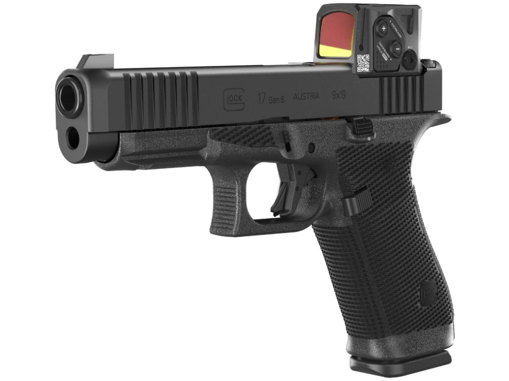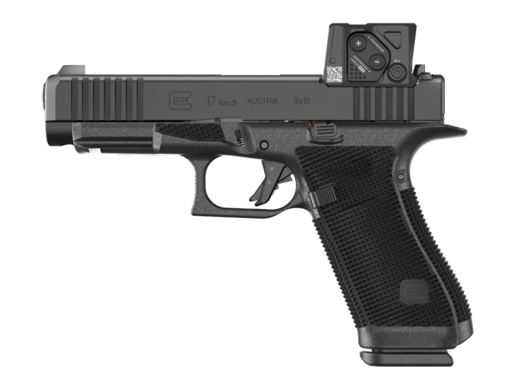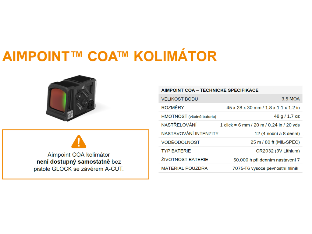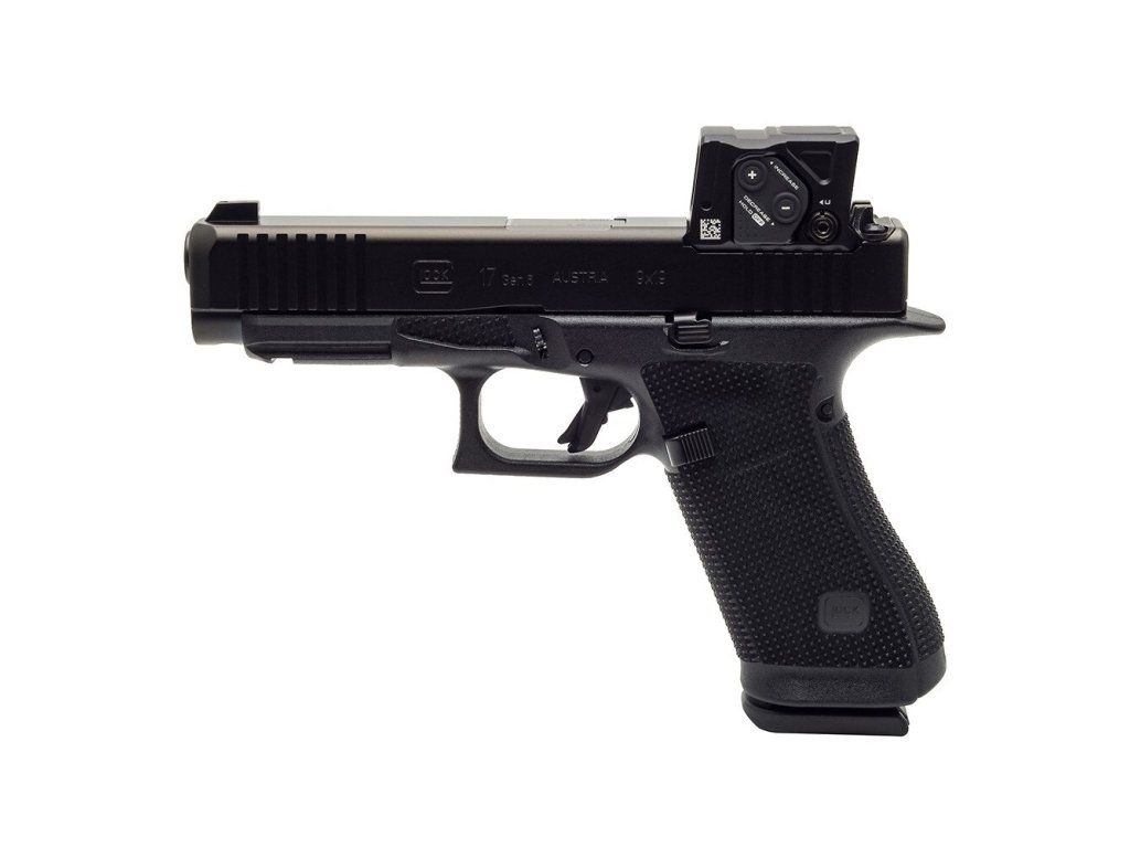 Samonabíjecí pistole Glock 17 Gen6 A-CUT je pistole velikosti STANDARD v ráži 9 mm Luger (9x19) v konfiguraci s kolimátorem Aimpoint COA, se závěrem s modulárním optickým systémem A-CUT konstruovaným pro kolimátor Aimpoint COA. Montážní rozhraní Aimpoint™ A-CUT™, které je vyříznuté přímo do závěru, umožňuje montáž nového kolimátoru Aimpoint™ COA™ bez jakéhokoliv adaptéru nebo montážní destičky, což zajišťuje nízký profil, vyšší stabilitu a přirozenější míření. Toto inovativní montážní rozhraní umožňuje rychlé a pevné uchycení zaměřovače, kdy přední hrana kolimátoru je uchycena v závěru a zadní hrana je pevně jištěna dvěma šrouby, které prochází zadním hledím. Kolimátor je tak posazen níže a umožňuje použití standardní výšky hledí a mušky (bez nutnosti použití Optic / Suppressor Ready mířidel). Kolimátor Aimpoint COA® je navržen pro rychlé zachycení cíle a přesnou střelbu i v náročných podmínkách. Záměrný bod červené barvy má velikost 3,5 MOA. Kolimátor umožňuje nastavit 12 stupňů intenzity (4 noční a 8 denních). Napájecí baterie CR2032 3V má přibližnou životnost 50.000 hodin (při denní intenzitě 7). Baterie je přístupná, i když je kolimátor namontován na závěru pistole. |