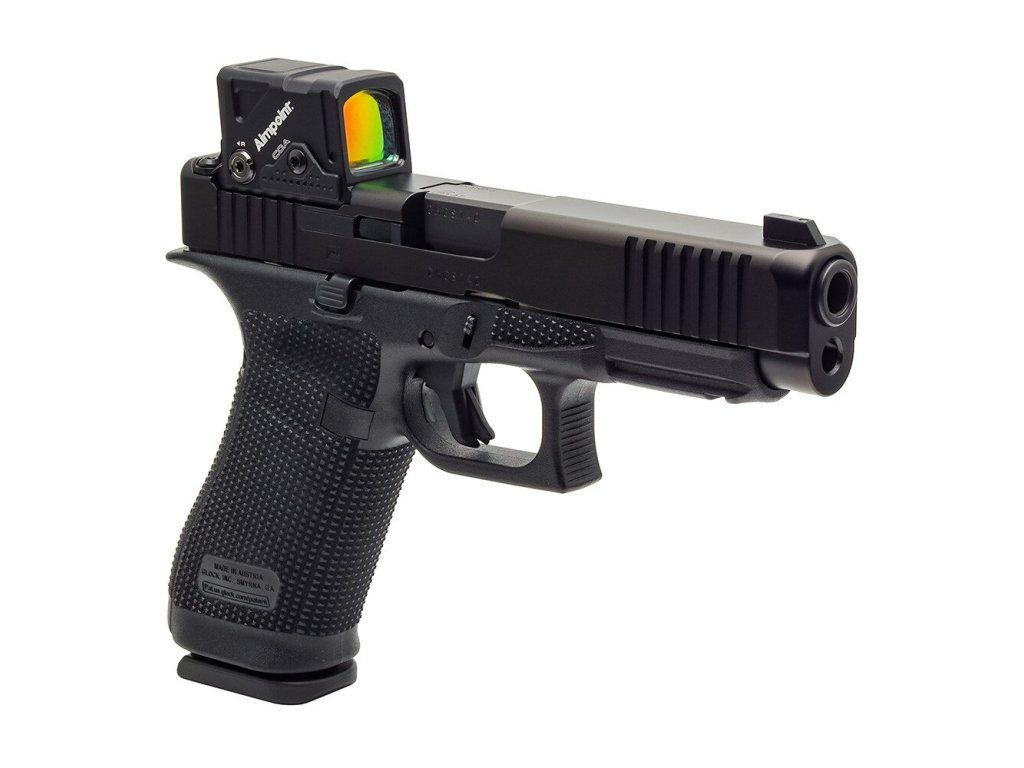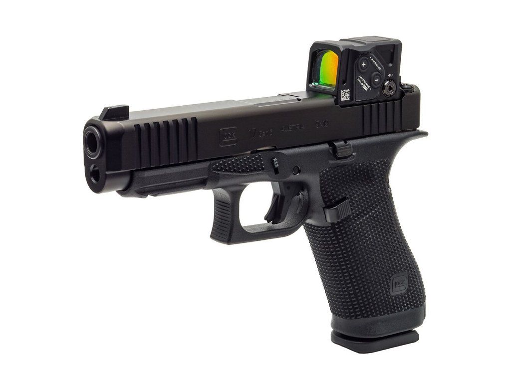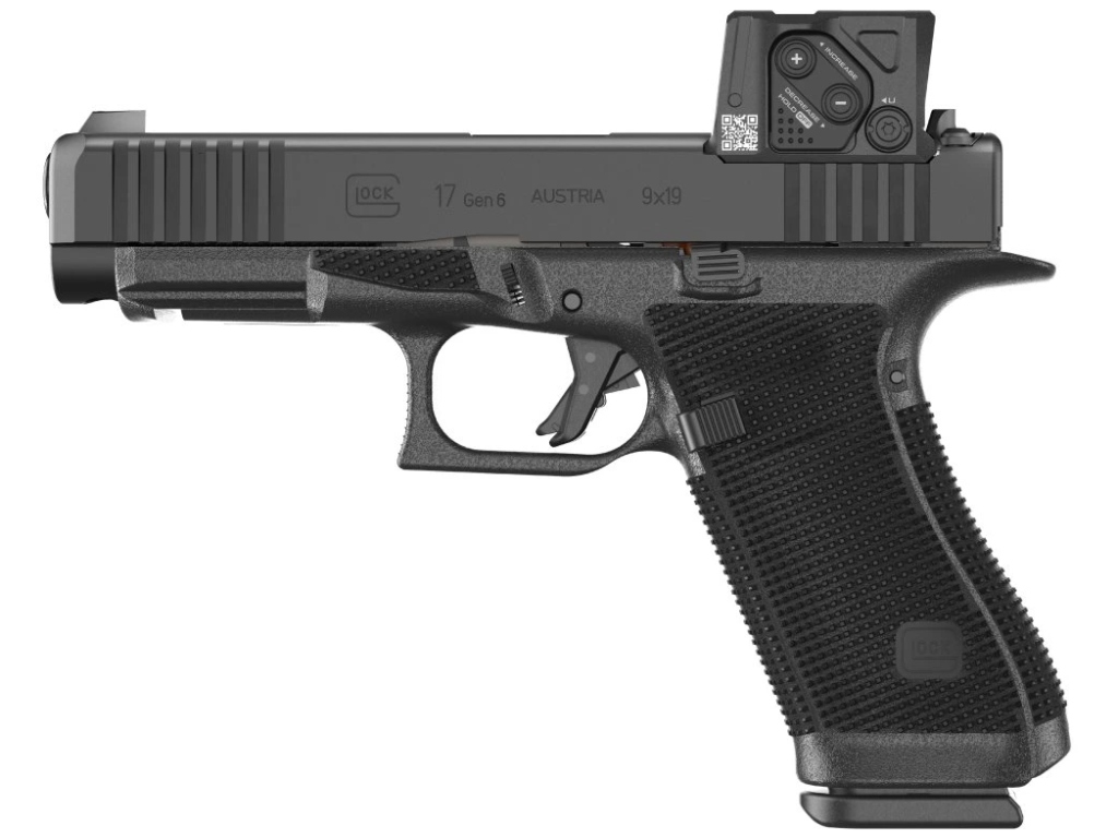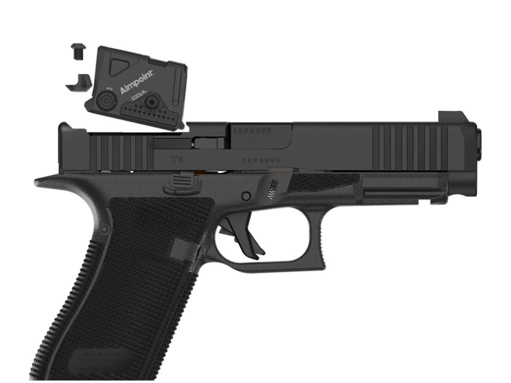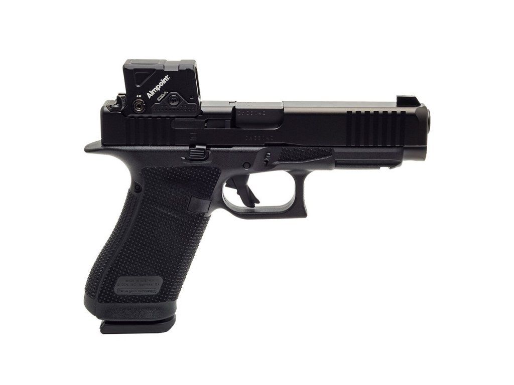 Samonabíjecí pistole Glock 17 Gen6 A-CUT je pistole velikosti STANDARD v ráži 9 mm Luger (9x19) v konfiguraci s kolimátorem Aimpoint COA, se závěrem s modulárním optickým systémem A-CUT konstruovaným pro kolimátor Aimpoint COA. Montážní rozhraní Aimpoint™ A-CUT™, které je vyříznuté přímo do závěru, umožňuje montáž nového kolimátoru Aimpoint™ COA™ bez jakéhokoliv adaptéru nebo montážní destičky, což zajišťuje nízký profil, vyšší stabilitu a přirozenější míření. Toto inovativní montážní rozhraní umožňuje rychlé a pevné uchycení zaměřovače, kdy přední hrana kolimátoru je uchycena v závěru a zadní hrana je pevně jištěna dvěma šrouby, které prochází zadním hledím. Kolimátor je tak posazen níže a umožňuje použití standardní výšky hledí a mušky (bez nutnosti použití Optic / Suppressor Ready mířidel). Kolimátor Aimpoint COA® je navržen pro rychlé zachycení cíle a přesnou střelbu i v náročných podmínkách. Záměrný bod červené barvy má velikost 3,5 MOA. Kolimátor umožňuje nastavit 12 stupňů intenzity (4 noční a 8 denních). Napájecí baterie CR2032 3V má přibližnou životnost 50.000 hodin (při denní intenzitě 7). Baterie je přístupná, i když je kolimátor namontován na závěru pistole. |