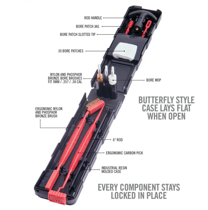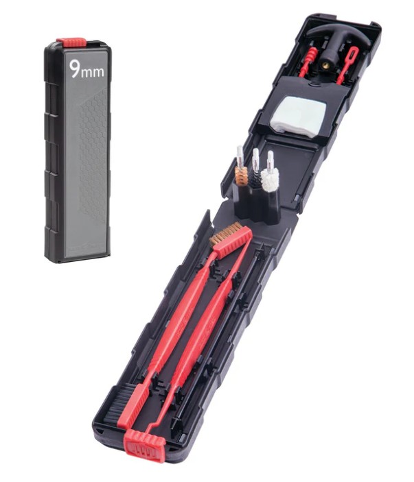 Unikátně poskládaná čistící sada pro zbraně v rážích 9 mm/.357/.38. Tato čistící sada není pouze čistící sadou, ale sadou, která uživateli poskytuje nástroje k čištění, a to navíc ve velmi praktickém boxu, který na jedné straně nabízí velký oboustranný kartáč a škrabku, uprostřed 2 kartáče a vytěrák hlavně, a na straně druhé T-rukojeť, prodlužovací tyčinky a zásobník na hadříky. Vše je navrhnuto tak, aby do sebe perfektně zapadlo a necinkalo.
