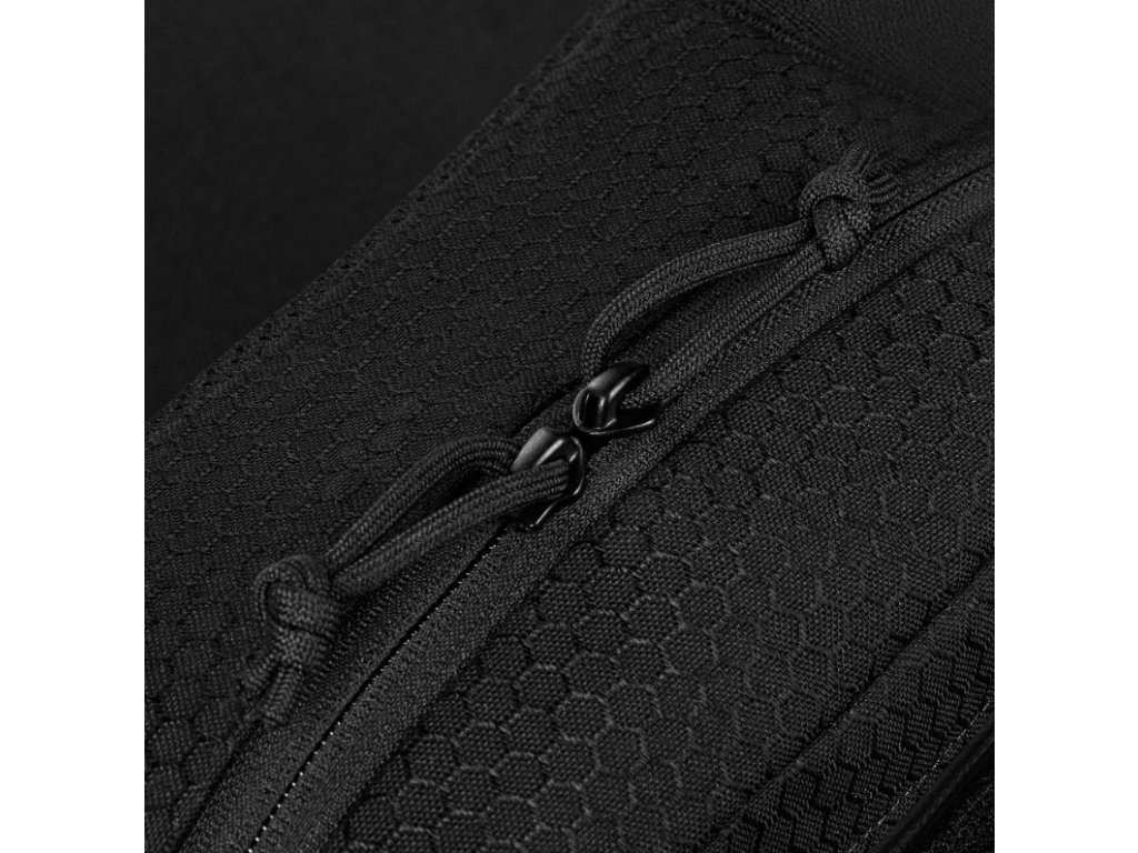 Ledvinka v černém stylovém provedení s decentním pokrytím v designu včelí plástve se skládá z primární kapsy, uvnitř které je našitý suchý zip pro připevnění organizátorů a kapsiček, a sekundární, menší kapsy. Na sekundární kapse nalezneme velcro panel pro uchycení nášivek. Po stranách jsou našita oka pro uchycení dalšího materiálu. Zadní strana ledvinka je ušita ze síťoviny. Popruh je vybaven rozepínací sponou Woojin pro rychlé rozepnutí. Ledvinku tedy lze nosit normálně, kolem pasu, nebo přes rameno. Použitými materiály jsou Cordura 500D a Cordura HEX 1000D. Celý produkt je vybaven YKK zipem. Na jezdcích primární kapsy je uvázán paracord, sekundární kapsa je opatřena táhlem z cordury a oka z plastu. |