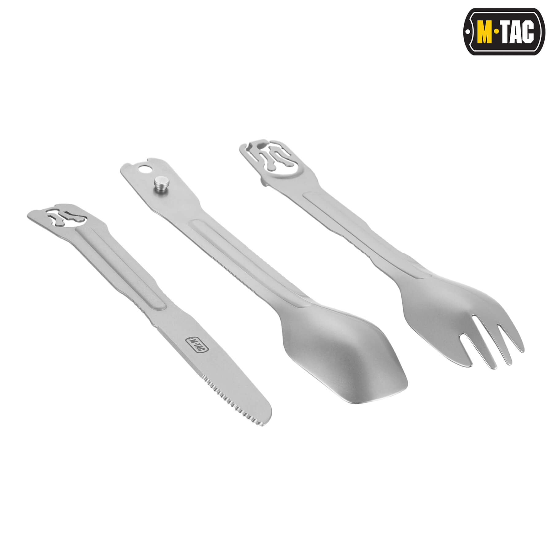 M-TAC Detachable Cutlery Set je praktické řešení pro stravování v terénu. Sada se skládá ze tří částí – lžíce, vidličky a nože. Příbory jsou vyrobeny z nerezové oceli 420, která nabízí dobrou odolnost proti korozi, snadnou údržbu, nepohlcuje pachy a neovlivňuje chuť potravin. Rozložení sady: