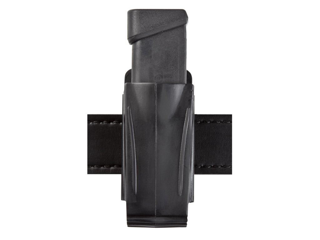 Černé vnější kydexové pouzdro na zásobníky určené pro pistoli Glock 17 nebo 19 s plným sweatguardem a průvlekem na opasek.