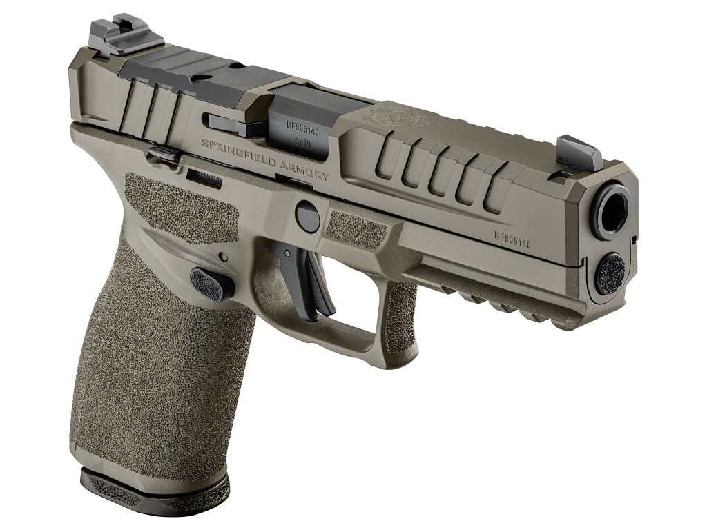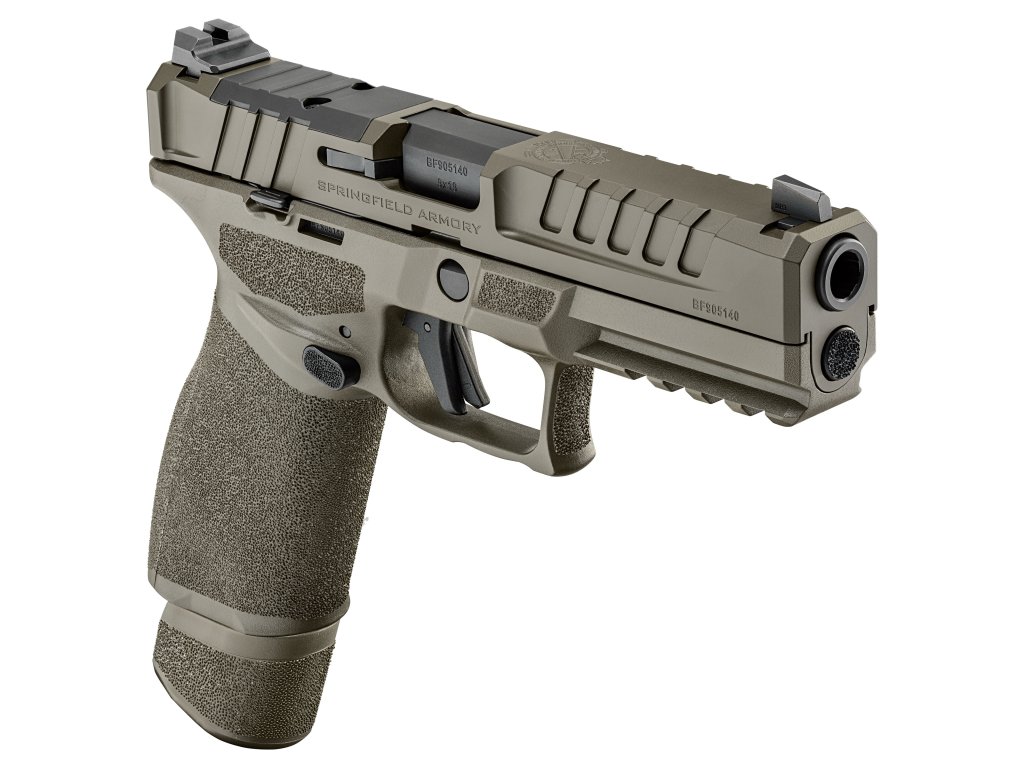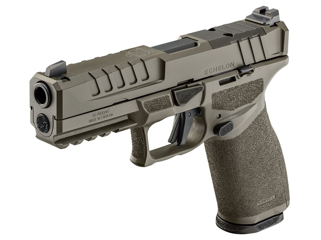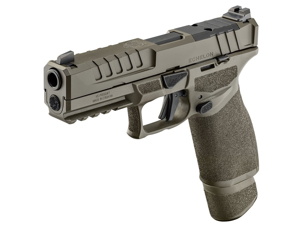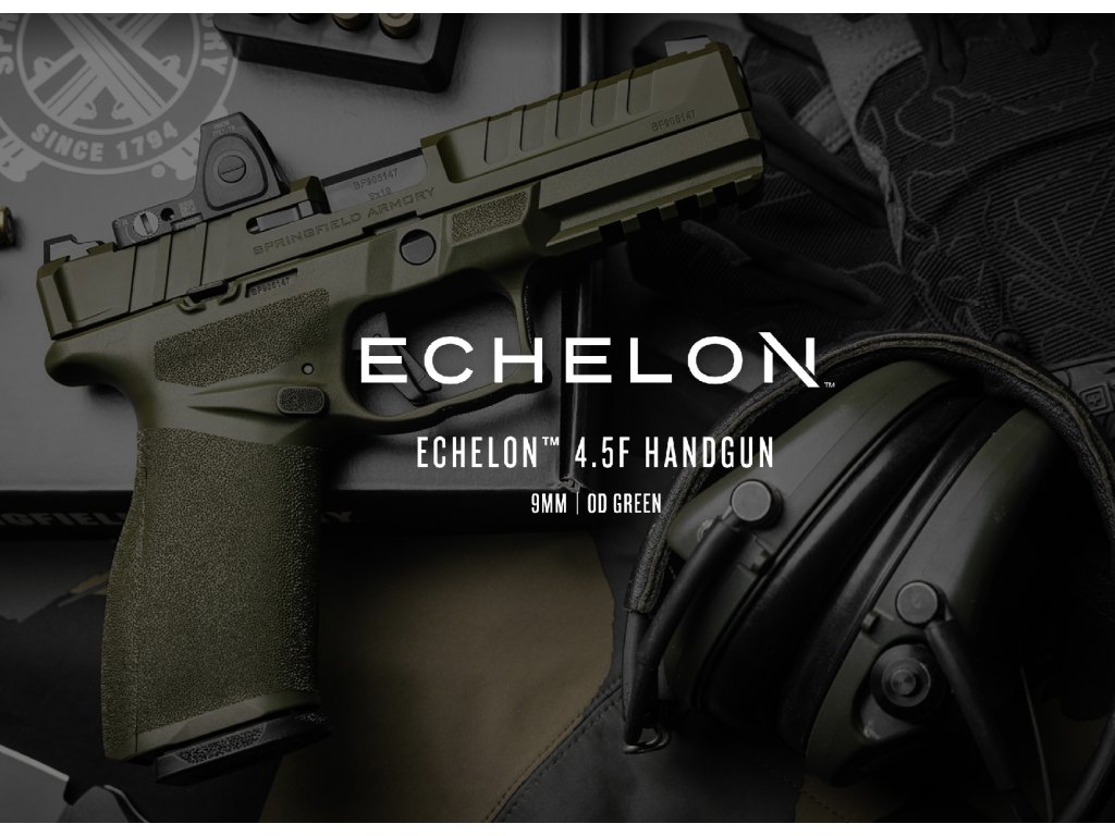 Společnost SPRINGFIELD ARMORY nám přináší model Echelon v ráži 9 mm a OD GREEN variantě. Nejedná se však o další nevýraznou samonabíjecí striker-fired pistoli s polymerovým rámem, protože svou kombinací přesnosti, spolehlivosti, bezpečnosti a pohodlí je vhodná pro střelce, kteří právě takový komfort hledají. Echelon je vybaven odnímatelným spoušťovým mechanismem COG (Central Operating Group), který je uložen v nerezovém obalu a tvoří tak jeden kus, který lze bez problému vyjmout pro kompletní čištění zbraně či výměnu nebo úpravu rámu. Konstruktéři nezapomněli ani na drobnost jako je ergonomické vybrání lučíku. Závěr je opatřen montáží VIS, která dělá zbraň ihned po vybalení opravdu připravenou pro namontování kolimátoru (montážní sada je obsahem balení). Montáž je profilována vcelku nízko, což umožňuje při náhlém výpadku kolimátoru používat i pevná mířidla, kdy muška je vybavena tritiovou kapslí a hledí profilováno do U a zvýrazněno nátěrem. Přední a zadní část závěru je vroubkovaná pro lepší manipulaci s ním. Rukojeť pistole je upravena hrubou, avšak příjemnou texturou pro lepší úchop. Tuto texturu rovněž najdeme i výše na rámu, neb zdrsněna je i oblast pro ukazováček a palec. Vroubkováním jsou na rámu zvýrazněny i jiné ovládací prvky jako pojistka spouště či oboustranné prvky jako záchyt závěru a vypouštění zásobníku. Kromě pojistky spouště disponuje pistole i indikátorem náboje v komoře. Pistole je vhodná jak pro leváky tak i praváky. Kapacita zásobníku je příjemných 17 až 20 nábojů, při prodloužení. V USA najdeme produkty značky HS Produkt pod licencí Springfield Armory.