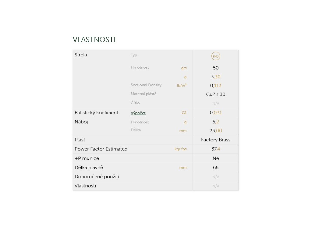 Kvalitní pistolový náboj od české produkce z Vlašimi. Celoplášťová, tvoří ji olověné jádro, které je překryto kovovým pláštěm (CuZn 30). Střela se vyznačuje pevnou konstrukcí, při zásahu cíle se nedeformuje – díky tomu vytváří hladký průstřel bez devastace tkáně. Tyto náboje vyrábí firma Sellier & Bellot®, která sídlí ve Vlašimi, jedná se tak o českou výrobu.. Jedná se o balení 50ks nábojů.