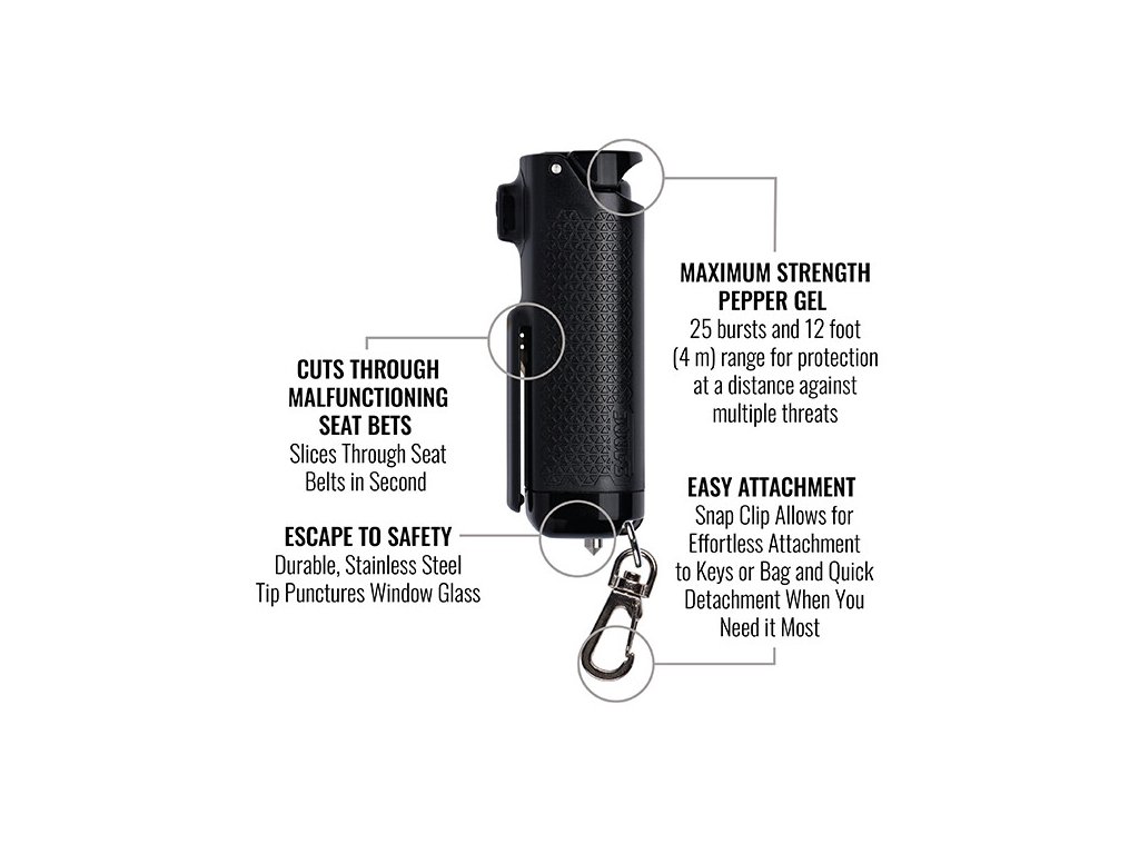 Zajistěte si bezpečnější cestování autem s pepřovým gelem SABRE Safe Escape 3 v 1. Tento pepřový gel vám pomůže v případě nouze vystoupit z vozidla a ochránit se před útokem. Bezpečnostní pásy mohou být po nehodě překážkou, ze které se musíte dostat. Vestavěný řezák pásů pomáhá přestřihnout bezpečnostní pásy a v případě nouze se osvobodit. Hrotem rozbijete okno, pokud jsou dveře vašeho vozidla zablokované nebo elektrické ovládání oken nefunguje. Tato jednotka aplikuje 5x více pepřového gelu a má dosah 4 metrů pro ochranu v bezpečné vzdálenosti. Obsahuje UV značkovací barvivo, které pomáhá úřadům identifikovat útočníka po jeho nastříkání. Odklápěcí víko umožňuje okamžité použití pepřového gelu ve stresových situacích, kdy záleží na sekundách. Díky exkluzivní HPLC zaručuje maximální sílu složení v každé nádobce, abyste měli klid, jistotu, spolehlivost a bezpečnost, když to nejvíce potřebujete. Pepřový gel SABRE se vyrábí v USA. Koupí tohoto produktu čestně prohlašujete, že jste osobou starší 18 let.