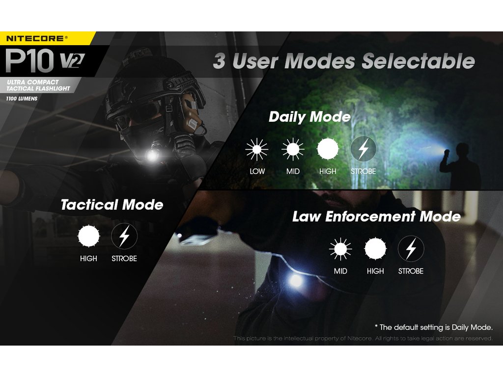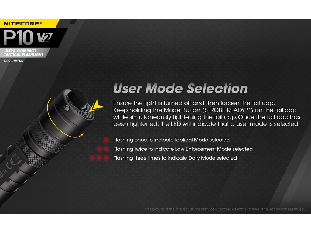 P10 V2 je nástupce taktické LED svítilny P10, která jako zdroj světla používá LED CREE XP-L2 V6 s výkonem max. 1100 lm. Díky použité elektronice je svítilna uzpůsobena na akumulátory 18650, RCR123A i lithiové baterie CR123A . Svítilna umožňuje volit mezi třemi nastaveními světelných režimů: