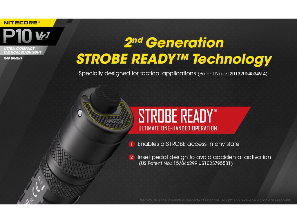 Svítilna je opatřena duálním patním spínačem, který umožňuje okamžitou aktivaci stroboskopu. Precisní parabola vytváří světelný paprsek s dosvitem 201 m. Jako další technické přednosti svítilny P10 jsou: tělo vyrobené z pevného leteckého hliníku s povrchovou úpravou HA III Military (černý elox), paměť navoleného světelného výkonu, ochrana proti nesprávnému vložení baterie, duální spínač poskytující pohodlné a jednoduché ovládání (patentováno), nerezový klip a odolnost svítilny vůči vodě a nárazu. Součástí balení je také praktické taktické pouzdro na opasek NTH10.