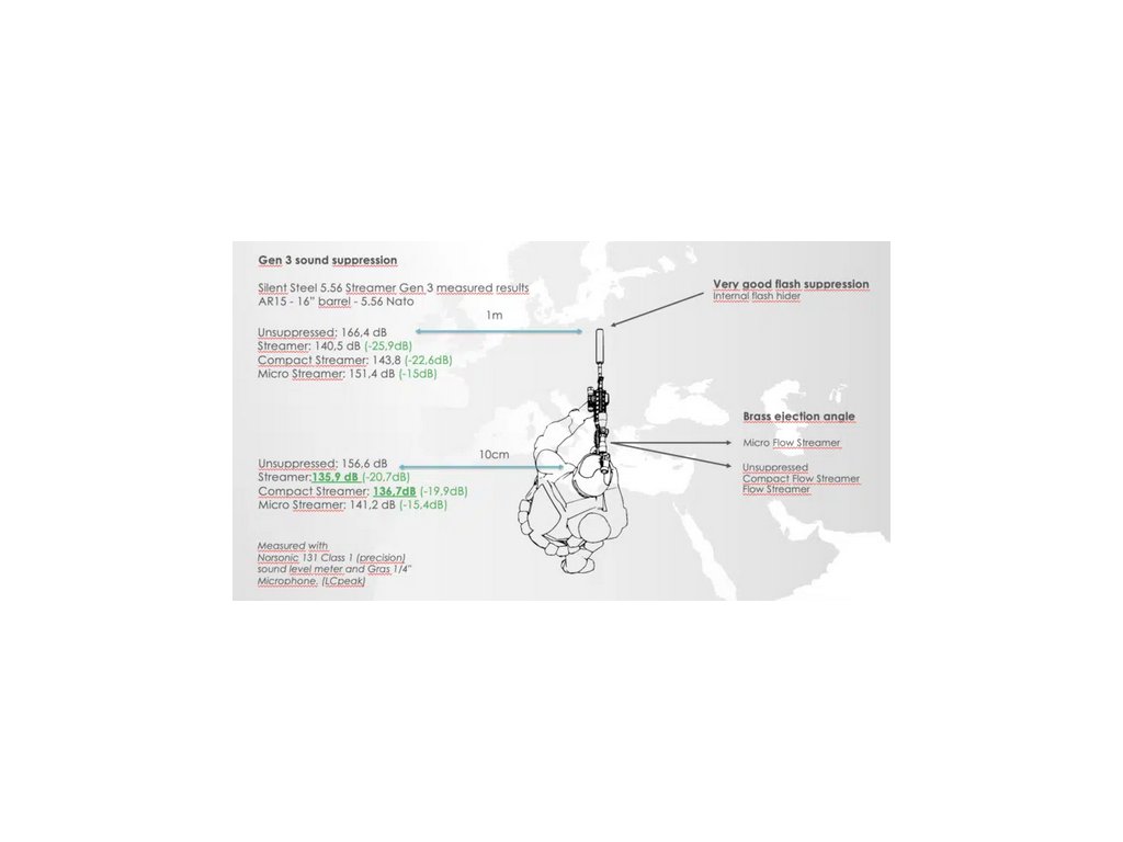 Tlumič tlumí nejen hluk, ale také úsťový záblesk. A to tak, že dokonale. Souvisí to s výše zmíněným řízeným tokem plynů směrem vpřed a také s tím, že dochází k velmi rychlému chlazení plynů. Šance, že dojde ke vznícení plynů je snížena na úplné minimum a vznik záblesků je tedy prakticky eliminován. Tento fakt z tlumiče Silent Steel Streamer dělá ideální variantu při použití za zhoršených světelných podmínek a to i v případě, že střelec používá NVG přístroje. Co to reálně znamená? Není záblesk = není zhoršení pozorovacích schopností přístroje.