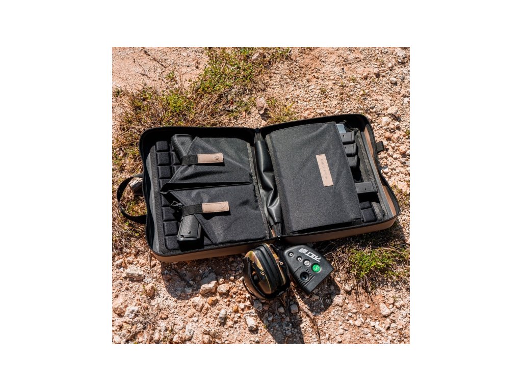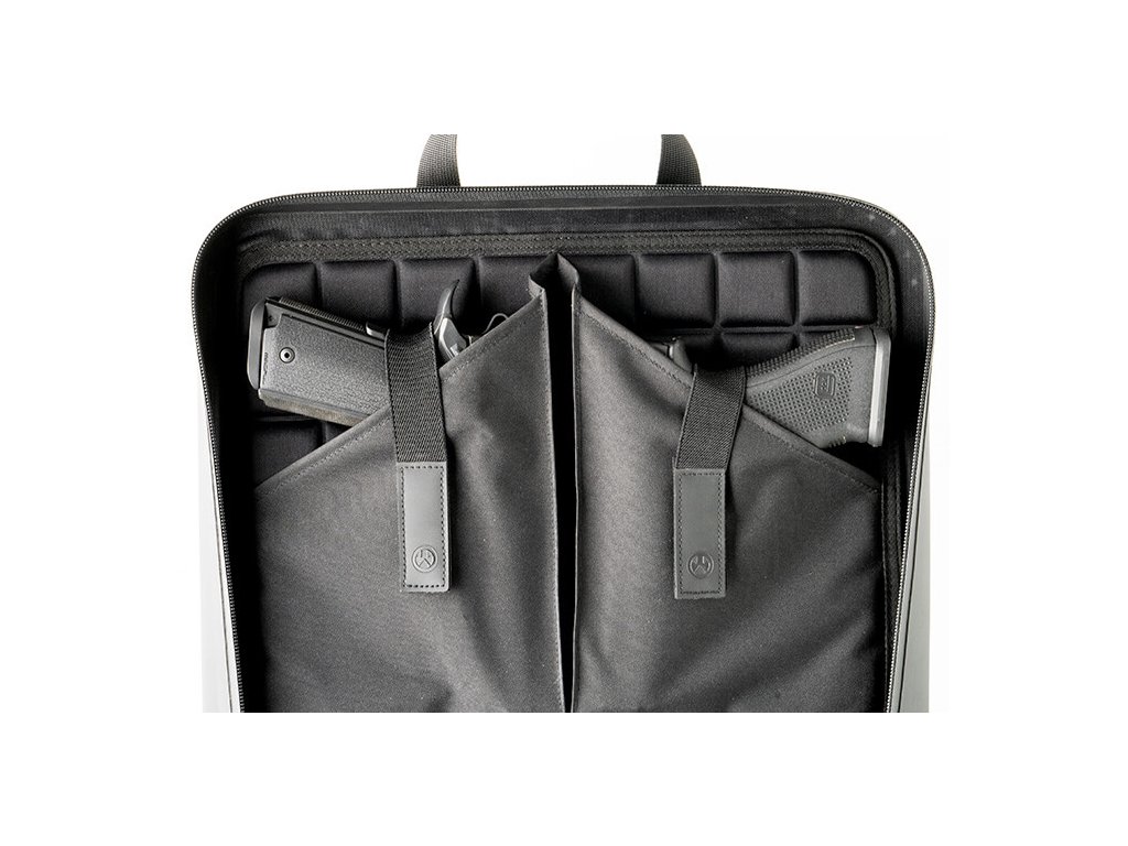 I když se jedná o velkoformátové transportní pouzdro na dvě pistole a zásobníky, stále si zachovává svou diskrétnost. Uvnitř ochranného pouzdra nalezneme na straně jedné dvě kapsy na pistole, ať už micro compact či full size, a na straně druhé jednu velkou kapsu na zásobníky či jiné příslušenství. Vnitřek pouzdra je vybaven panelem z EVA pěny z obou stran. Pro zajištění pistolí se na pistolové straně nacházejí jistící pásky, pro každou pistoli jeden, a na straně zásobníkové je pásků dokonce osm, pod kterou výrobce navíc přidal i kapsu na zip, kterou lze využít například pro uložení dokumentů. Pouzdro je vyrobeno z kvalitního materiálu DAKA a opatřeno voděodolným zipem YKK AquaGuard s táhlem z paracordu 550.