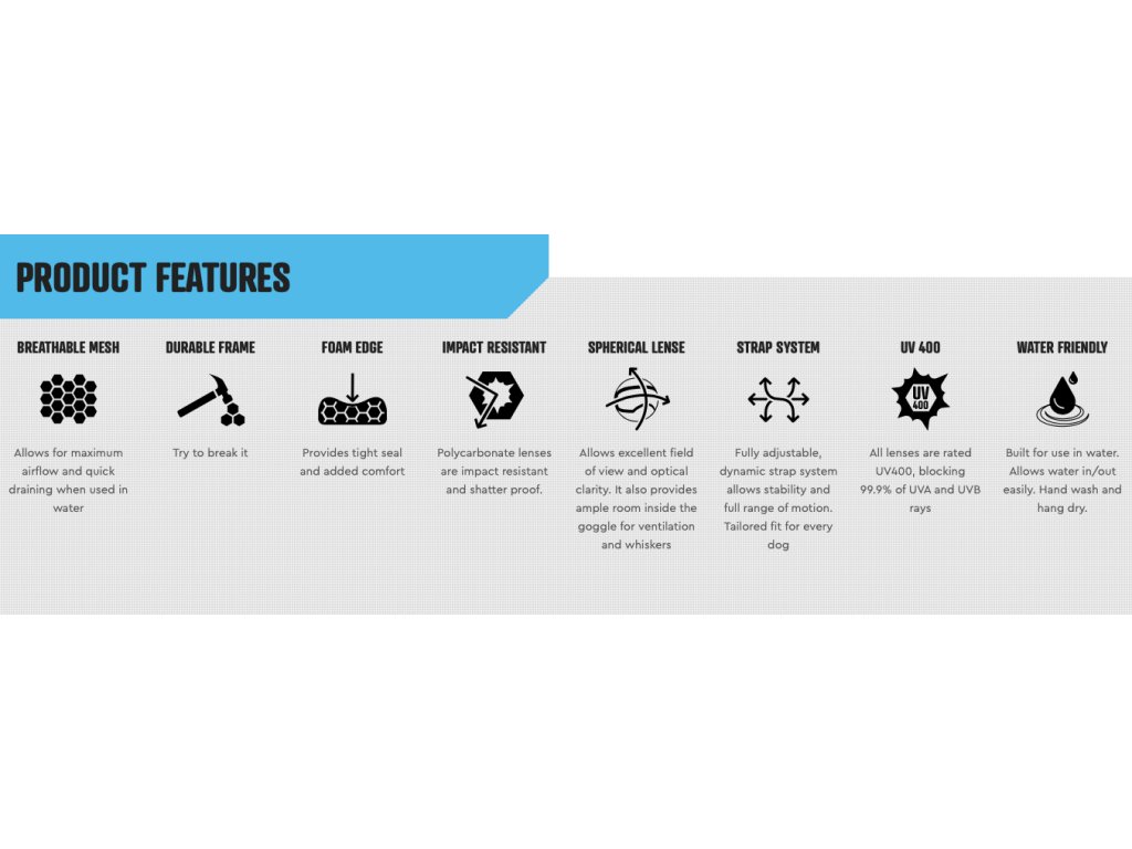 Vzhledem aktivitě psů oceníte u brýlí REX SPECS možnost výměny jejich skel. V tomto případě je řeč o kouřovém provedení, které je vyrobeno z polykarbonátu. Ochrana UV 400 ochrání psa před slunečními paprsky UVA / UVB. Výrobce udává i certifikované zkoušky odolnosti proti nárazu ANSI Z87.1-2010. V nabídce máme velikosti od XS po XL.
