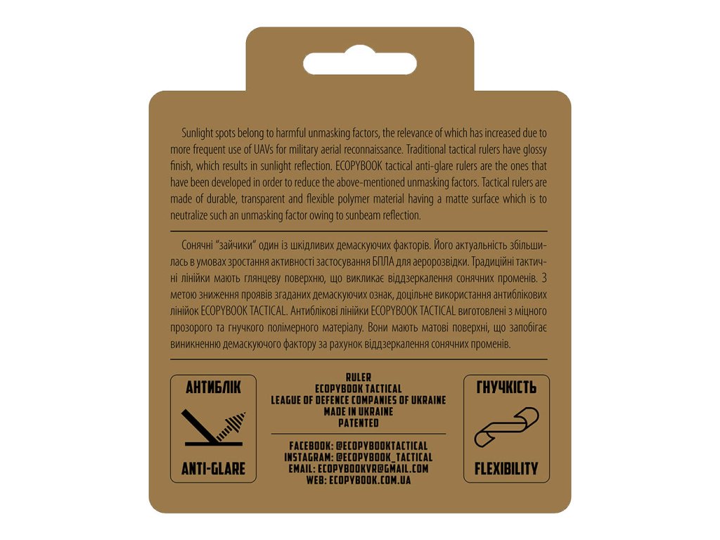 Taktické pravítko Ecopybook Tactical GTA je navrženo pro profesionální taktické použití s ohledem na požadavky moderního maskování a práce v terénu. Pravítko je vyrobeno z matného antireflexního materiálu, který minimalizuje odlesky slunečního světla – jeden z nejčastějších zdrojů vizuálního odhalení v terénních podmínkách. S rostoucím využíváním bezpilotních prostředků (UAV) pro letecký průzkum výrazně roste také potřeba neodrazivých plánovacích a mapových pomůcek. Na rozdíl od běžných lesklých taktických pravítek Ecopybook Tactical GTA UA nevytváří odlesky, čímž snižuje riziko prozrazení pozice při práci v terénu. Pravítko je vyrobeno z odolného, průhledného a flexibilního polymeru, který zajišťuje dlouhou životnost a pohodlné používání i v náročných podmínkách. |