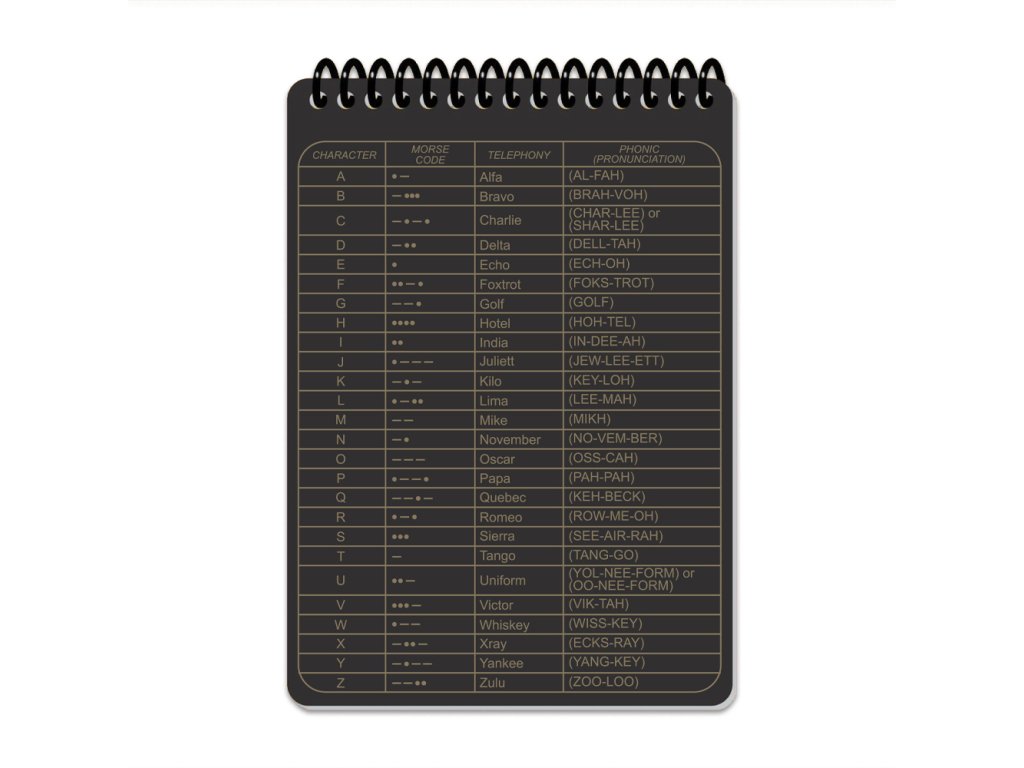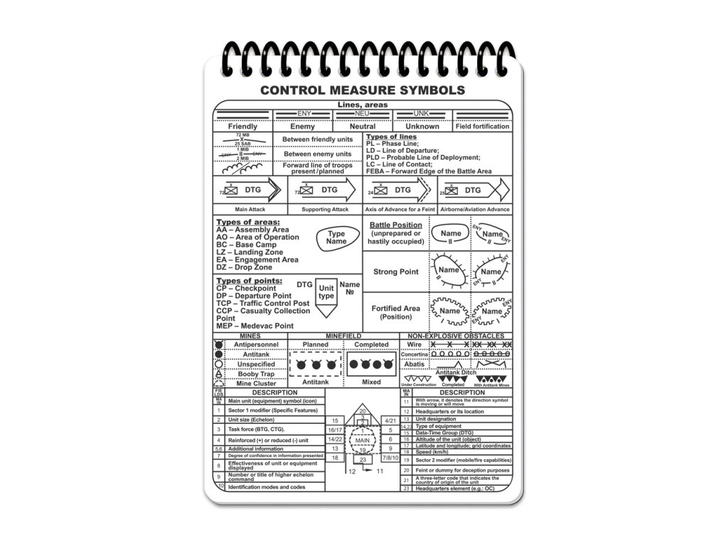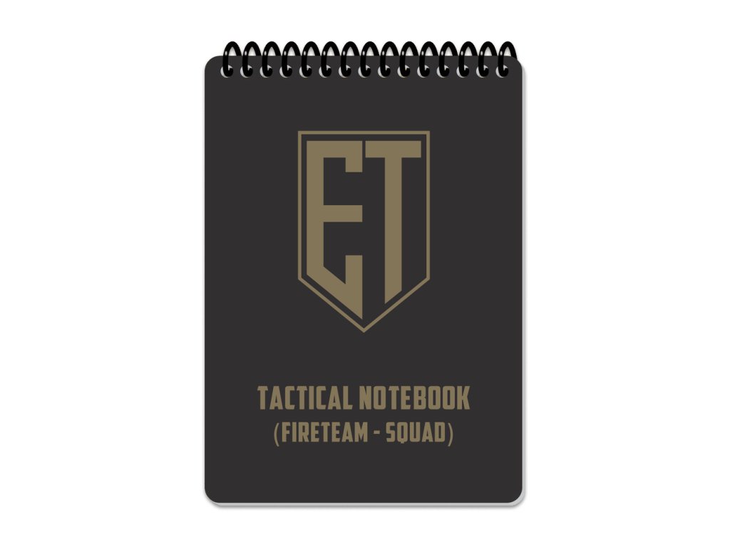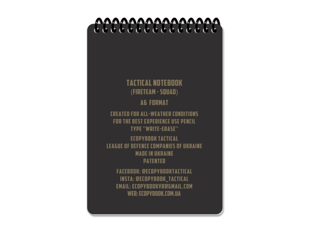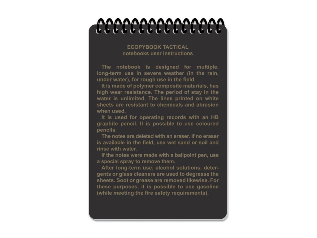 Ecopybook Tactical Notebook je odolný A5 zápisník do každého počasí, který se snadno vejde do kapsy a je navržen pro použití v extrémních podmínkách. Přední obal je vyroben z matného, proti oslnění odolného polymeru, zatímco stránky jsou z syntetického materiálu, který je odolný vůči vodě i oleji. Na stránky můžete psát běžnou tužkou. Pro vymazání poznámek lze použít gumu, nebo pokud jste venku, lze použít vlhký písek či zeminu a následně opláchnout vodou. Při pravidelném používání se doporučuje stránky občas odmastit, což lze provést pomocí alkoholových roztoků nebo čističů na povrchy a sklo. Zápisník obsahuje užitečné předlohy a pomůcky pro taktické i navigační úkoly: 1 NATO fonetická abeceda. 1 Žádost o lékařskou evakuaci, 1 Zpráva o výbušninách, 1 Žádost o palebnou podporu, 1 Zpráva o salutaci, 1 Standardní identifikace / fyzická oblast operací / velikost jednotky (echelon), 1 Stav zařízení / objektu, 1 Symboly jednotky / taktická úkoly, 1 Kontrolní symboly, 1 Příručka proti IED taktikám, 1 Příručka pro určení lineárních veličin pomocí „tisícové formule“ ,2 Karty palebných pozic, 10 Čtvercovaných listů, 1 Úhloměr, 2 Pravítka podle standardu NATO