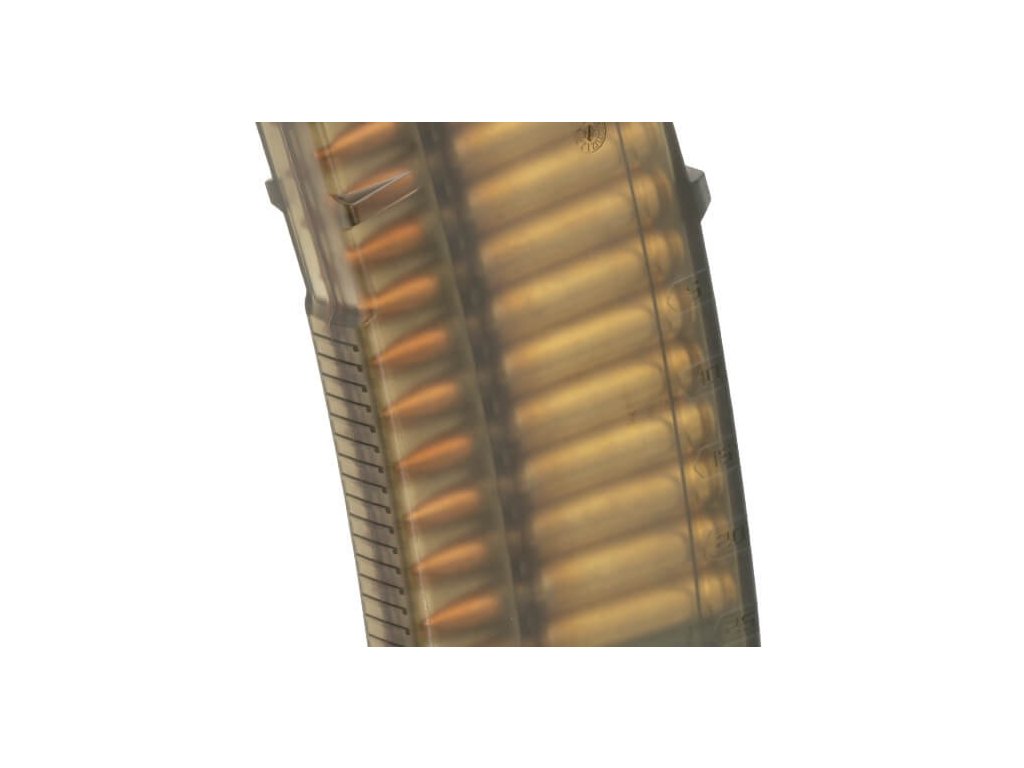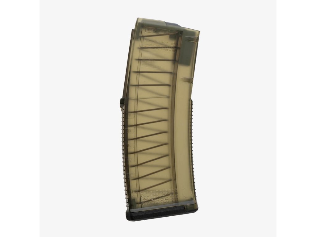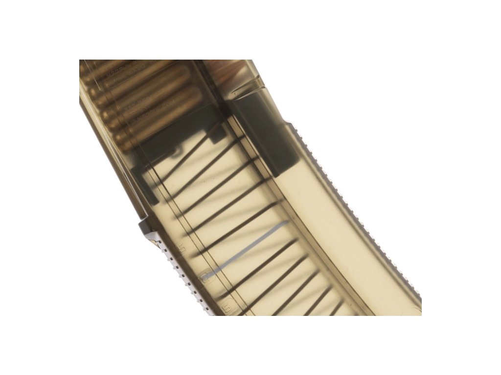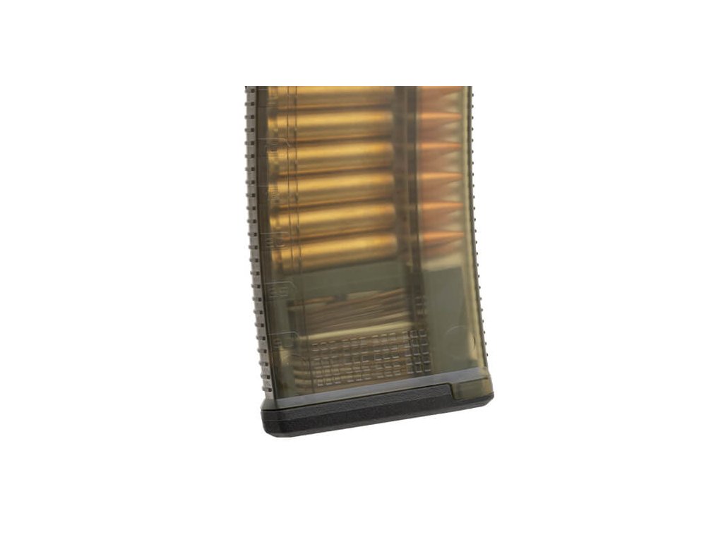 TMAG 30 AR/M4 GEN M3 je vysoce spolehlivý průhledný 30ranný zásobník pro zbraně kompatibilní se STANAG, komorované na 5.56×45 NATO /.223 Remington. Je vyroben z odolného průhledného polymeru s olivově zeleným odstínem, který umožňuje střelci vizuálně ověřit typ nábojů i aktuální počet ran.Přední a zadní část zásobníku je opatřena zdrsněním pro lepší úchop, zatímco boky jsou hladké, což zvyšuje průhlednost a přehlednost. Stejně jako u celé řady GEN M3, má TMAG 20 shodnou vnitřní geometrii, která zajišťuje bezkonkurenční spolehlivost při střelbě. Podavač se čtyřmi vodiči, díky kterým se nenaklání, je spárován s odolnou nerezovou pružinou. Bodová matice pro popisovače umožňuje snadné vlastní označení zásobníku. Nízkoprofilová základna je kompatibilní s veškerým příslušenstvím určeným pro zásobníky PMAG AR/M4 GEN M3. Zásobník je optimalizován pro platformy AR15/M4 typu Colt, ale upravená vnitřní a vnější konstrukce umožňuje použití i s dalšími zbraněmi, jako jsou HK 416 / MR556A1 / M27 IAR, FN SCAR MK 16/16S a další. |