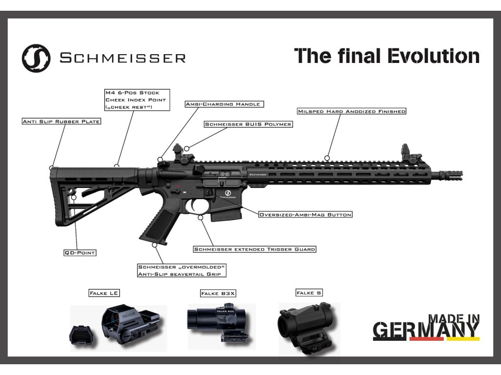Schmeisser si klade za cíl vyrábět nejlepší AR-15 s nálepkou Made in Germany ve svém závodě v Krefeldu. Výroba a kontrola kvality tvoří klíčovou součást výrobního procesu. Ať už pro lovce, sportovní střelce nebo pro domácí a mezinárodní policejní a vojenský trh - všechny modely Schmeisser jsou vyráběny v Německu v přísném souladu s ISO 9001. To společnosti Schmeisser umožňuje zajistit trvale vysokou kvalitu a dodací kapacitu potřebnou k uspokojení poptávky zákazníků. Nové modely AR-15 kalibru 9×19 a nový 60 ranný zásobník Schmeisser pro ráže .0,223 Remington jsou dva skvělé příklady toho, jak společnost Schmeisser úspěšně čelila výzvám optimalizace a rekonstrukce svých produktů.Dřívější 9mm samonabíjecí pušky jsou k dispozici jako sportovní nebo lovecké pušky a svým správným fungováním vynikají u konkurenčních produktů bez ohledu na to, jaké střelivo dostupné na trhu se používá.